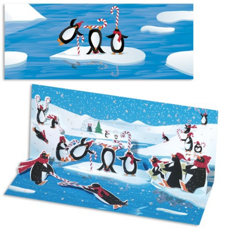 Felicitarea 3D Panoramics pentru Craciun - Pinguini este o felicitare din carton de cea mai buna calitate, cu elemente tridimensionale, care iti va fascina intreaga familie. Inchisa, aceasta felicitare ne prezinta trei pinguini nazdravani, iar daca o deschizi vei descoperii intregul peisaj de basm.