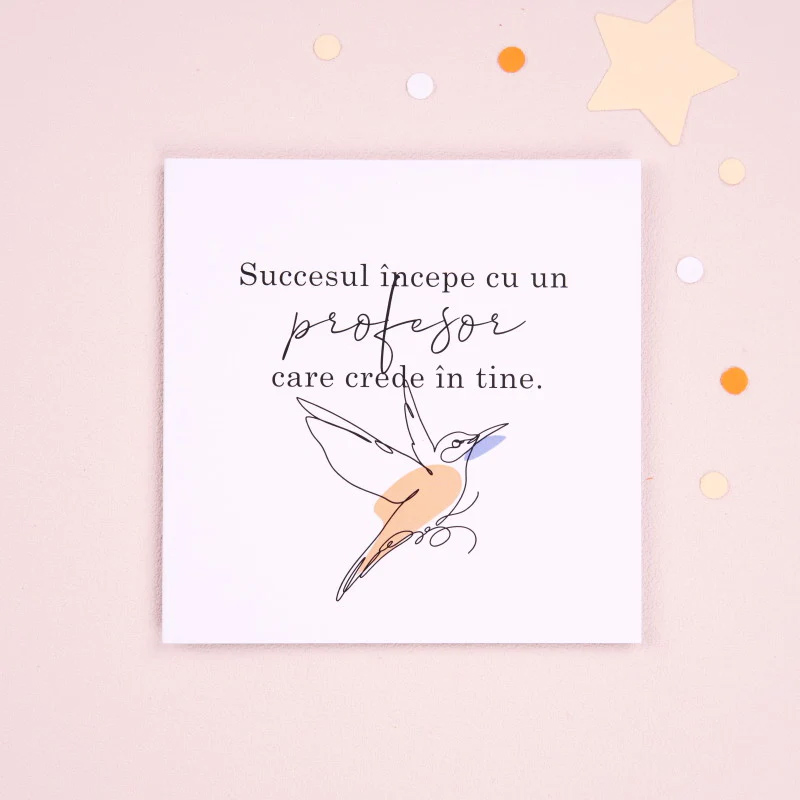 Felicitarea cadou "Best teacher" e gandita pentru profesorii care stiu sa vada potentialul din fiecare elev. Adauga buchetului de flori cu care ii multumesti profesoarei tale preferate pentru tot ce a facut pentru tine felicitarea cu mesajul "Succesul incepe cu un profesor care crede in tine". Mesajul emotionant ii va transmite recunostinta ta pentru efortul pe care l-a depus ca sa iti dea aripi.