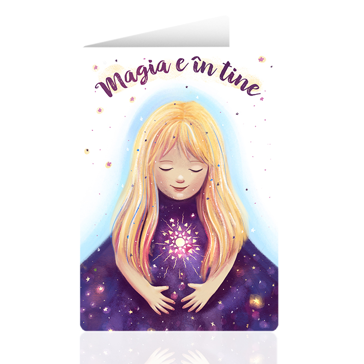 Felicitare cu o fată cu stele pe piept, și textul „Magia e în tine”. Se alătură perfect unui cadou dat din suflet.