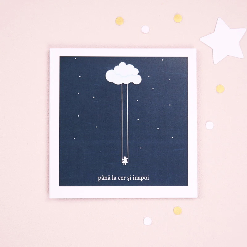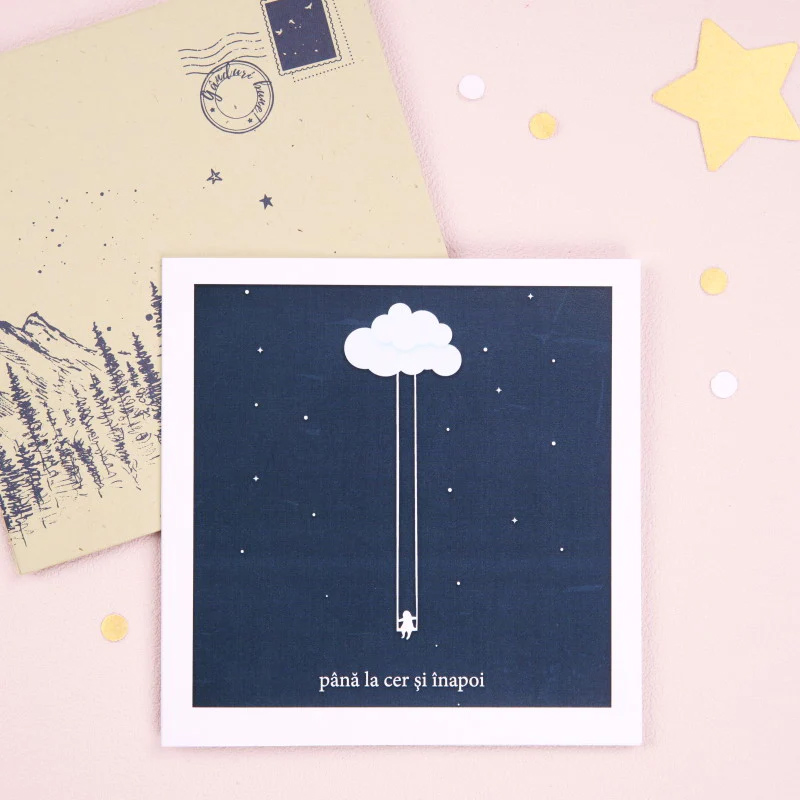 Un cadou de un romantism aparte, felicitarea "Pana la cer" a fost creata pentru ca tu sa poti exprima in cuvinte cat de mult iubesti. "Pana la cer si inapoi", ar putea parea suficient, nu? Teoretic. Practic, jumatatea ta ar putea replica - "Bine, bine. Pana la cer si inapoi. Dar... cate ture?" :) Pentru asta, am lasat interiorul gol, ca sa poti scrie cu manuta ta detaliile tehnice despre ture, ani lumina sau vehicule folosite.