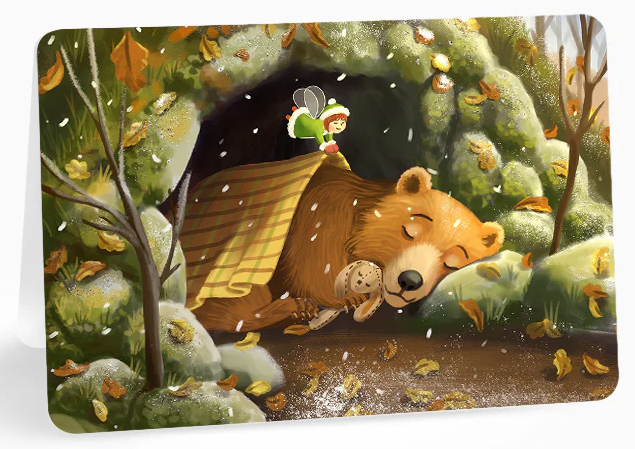Felicitare cu micuța zână Lia acoperind ursul cu o pătură atunci când el se pune la hibernat.
