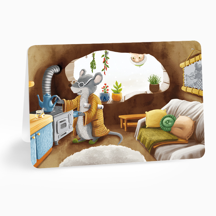 Felicitare cu micuța zână Lia în vizită la șoricel în timp ce acesta face un ceai. Se alătură perfect unui cadou dat din suflet.