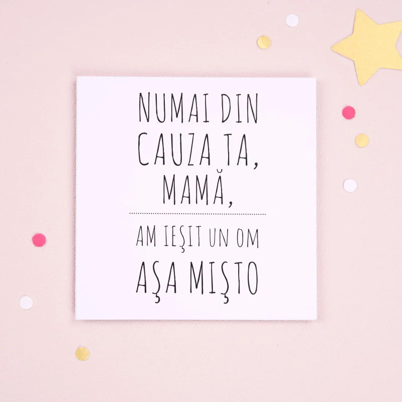 Felicitarea "Vina mamei" e un cadou amuzant si emotionant pentru femeia extraordinara care este, asa ca reaminteste-i mamei tale cat de mult inseamna pentru tine, cu ocazia zilei de 8 Martie, de Craciun, de ziua ei sau oricand simti ca are nevoie sa stie asta. Am imprimat pe felicitare mesajul: "Numai din cauza ta, mama, am iesit un om asa misto" pentru ca, recunoaste, merita! E numai vina ei!