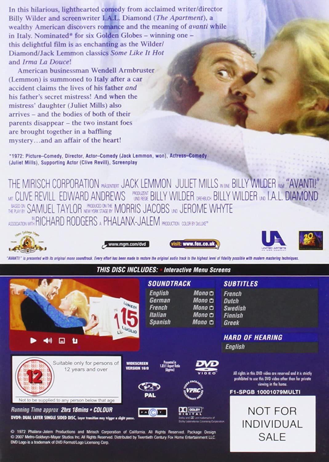 In 'Avanti!' (1972), Jack Lemmon stars as American executive Wendell Armbuster. On travelling to Italy to recover his father's body after a car accident, Wendell soon becomes tied up in endless red tape, and is shocked to discover that his father had a mistress, who also died in the car crash. The mistress' daughter, Pamela Piggott (Juliet Mills), arrives in Italy to collect her mother's body, and she and Wendell embark on a series of misadventures both comic and romantic.