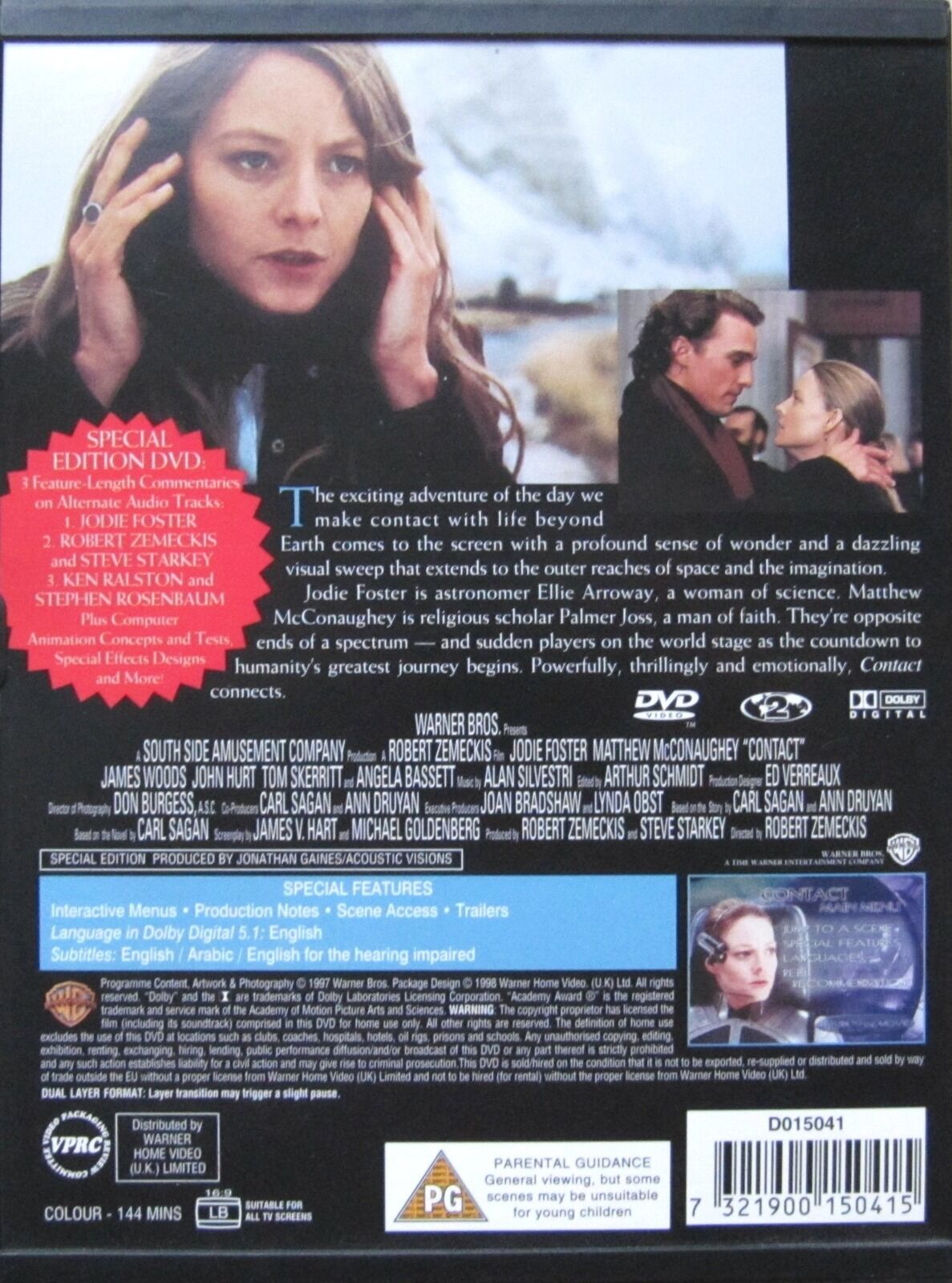 The exciting adventure of the day we make contact with life beyond Earth comes to the screen with a profound sense of wonder and a dazzling visual sweep that extends to the outer reaches of space and the imagination. Jodie Foster is astronomer Ellie Arroway, a woman of science. Matthew McConnaughey is religious scholar Palmer Joss, a man of faith. They're opposite ends of a spectrum - and sudden players on the world stage as the countdown to humanity's greatest journey begins. Powerfully, thrillingly and emotionally, Contact connects.