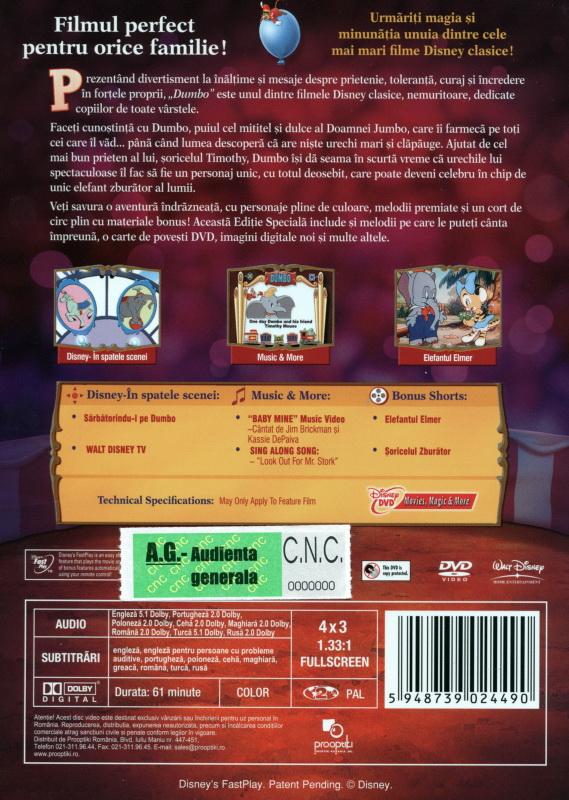Faceti cunostinta cu Dumbo, puiul cel mititel si dulce al Doamnei Jumbo, care ii farmeca pe toti cei care il vad...pana cand lumea descopera ca are niste urechi mari si clapauge. Ajutat de cel mai bun prieten al lui, soricelul Timothy, Dumbo isi da seama in scurta vreme ca urechile lui spectaculoase il fac sa fie un personaj unic, cu totul deosebit, care poate deveni celebru in chip de unic elefant zburator al lumii.