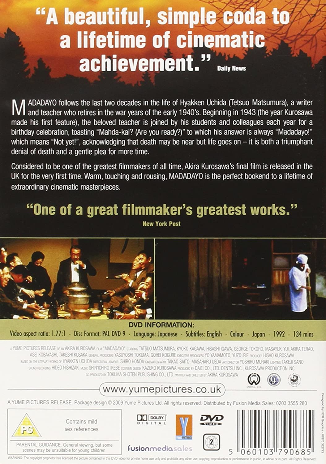 Considered to be one of cinemas greatest talents, Akira Kurosawa s final film is released in the UK for the very first time. Warm, touching and rousing, MADADAYO is the perfect bookend to a lifetime of cinematic achievements. MADADAYO follows the last two decades in the life of Hyakken Uchida (Tetsuo Matsumura), a writer and teacher who retires in the war years of the early 1940 s. Beginning in 1943 (the year Kurosawa made his first feature), he is beloved by his students and colleagues who join him each year for a birthday celebration, toasting Mahda-kai? (Are you ready?) to which his answer is always Madadayo! which means Not yet! , acknowledging that death may be near but life goes on it is both a triumphant denial of death and a gentle plea for more time. In an interview at the time of the film's release, Kurosawa said his movie is about 'something very precious, which has been all but forgotten: The enviable world of warm hearts.' He added 'hope that all the people who have seen this picture will leave the theatre feeling refreshed, with broad smiles on their faces'