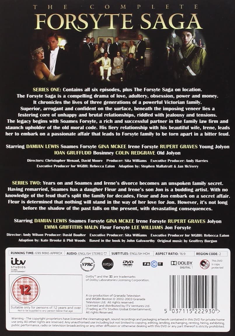 The Complete Forsyte Saga is a four-disc box set comprising series one and two of the television drama, which is based on the novels by John Galsworthy. Set at the turn of the 20th century, it profiles three generations of the Forsytes--an upper class Victorian family--and their relationships with each other, as they experience a tumultuous period in British history. Damian Lewis stars as Soames Forsyte, a rich London lawyer who marries the very gorgeous Irene (Gina McKee) in order to complete his picture-perfect life. The show also stars Ioan Gruffudd (as an architect named Phillip Bosinney), and Rupert Graves (as the serial-marrying painter and Irene's later husband, Young Jolyon Forsyte).