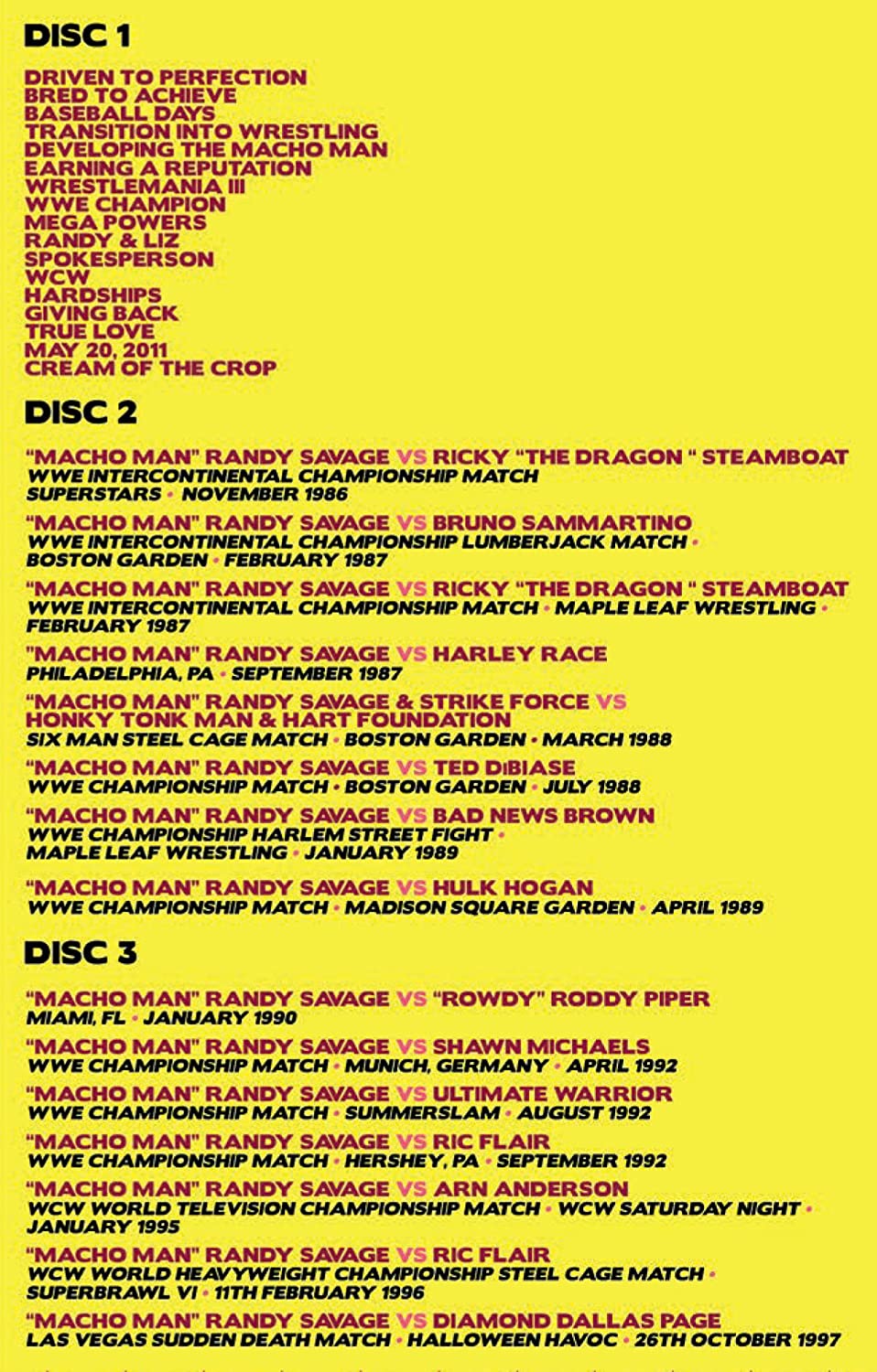 The Randy Savage Story focuses on the life and career of Randy Macho Man Savage. The title chronicles the highs and lows of Randy's life and career, and shows that while he was extremely driven and highly successful, he was a complex person who also had his struggles over the years. Later in his life, Randy remarried and found peace before his tragic and untimely death.