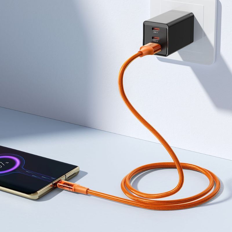 Cablul Amber Series Fast Charging Type-C la Mcdodo cu o carcasă transparentă, estetică tehnologică vizibilă, se vede clar că componentele circuitului său sunt ordonate, subliniind frumusețea măiestriei.