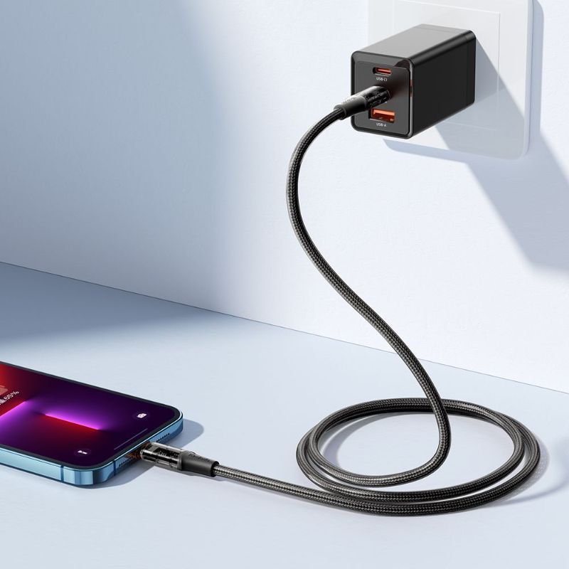 Cablul Amber Series Fast Charging Type-C la Lightningde la Mcdodo cu design transparent de conector, pentru a vedea clar componentele circuitului, cablu absolut izbitor și suportă încărcare rapidă de 36 W și transmisie de date de 480 Mbps.