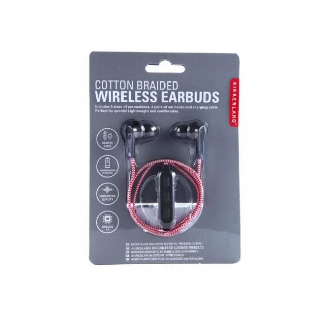Caști wileless de la Kikkerland. Aceste căști funcționează fără cablu și, prin urmare, nu trebuie conectate la mufa pentru căști a unui telefon, tabletă sau laptop. Firul împletit în roșu și alb al căștilor nu poate încurca.