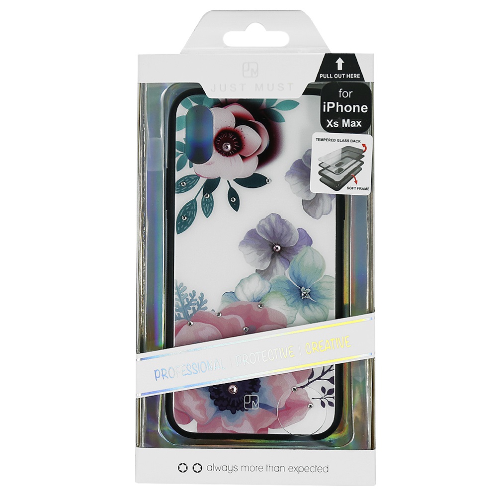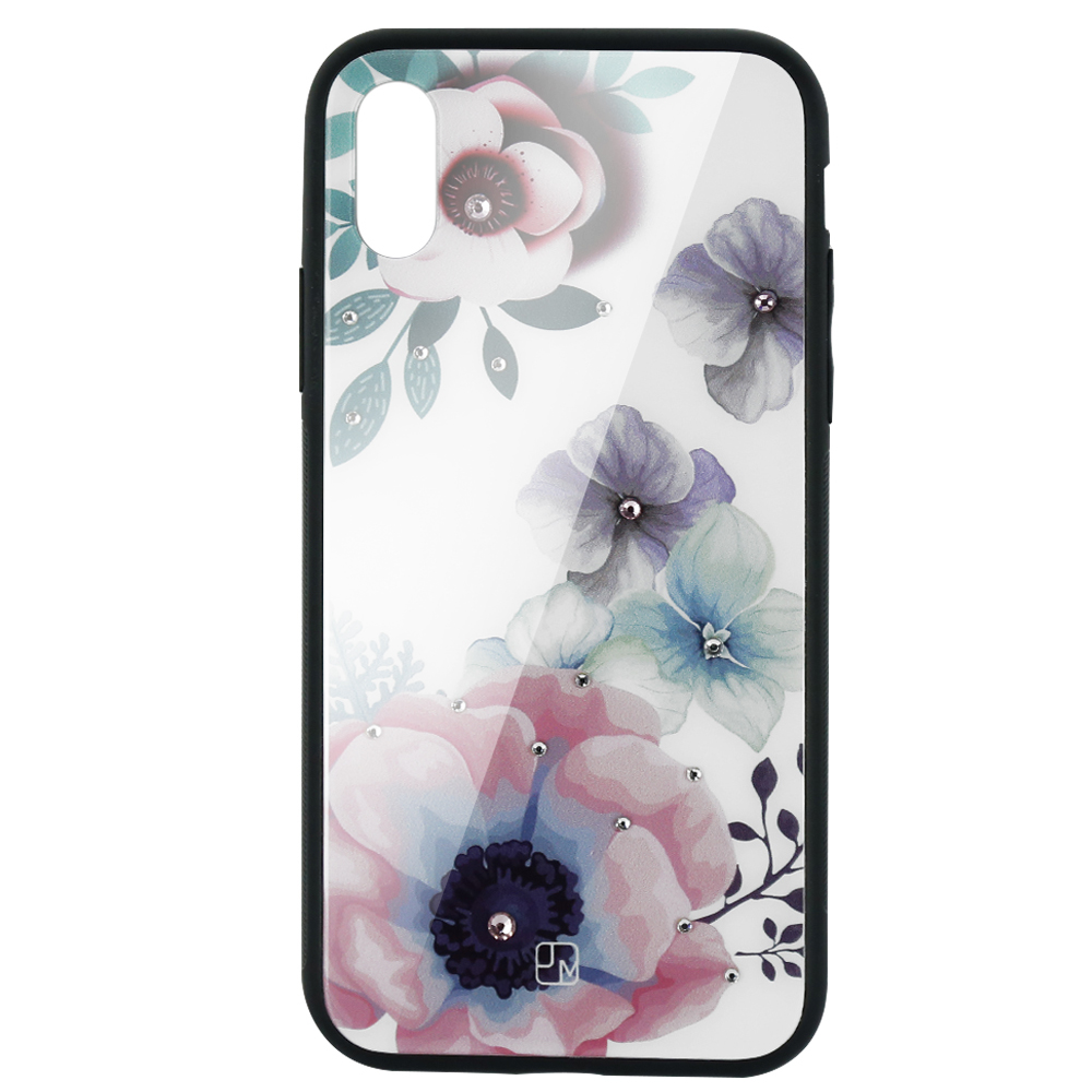 Carcasa cu spate de sticla pentru iPhone XS Max de la Just Must ofera protectie impotriva zgarieturilor si socurilor. Are un aspect lucios, modern si elegant cu un model floral printat pe spate si definitivat cu cristale aplicate.