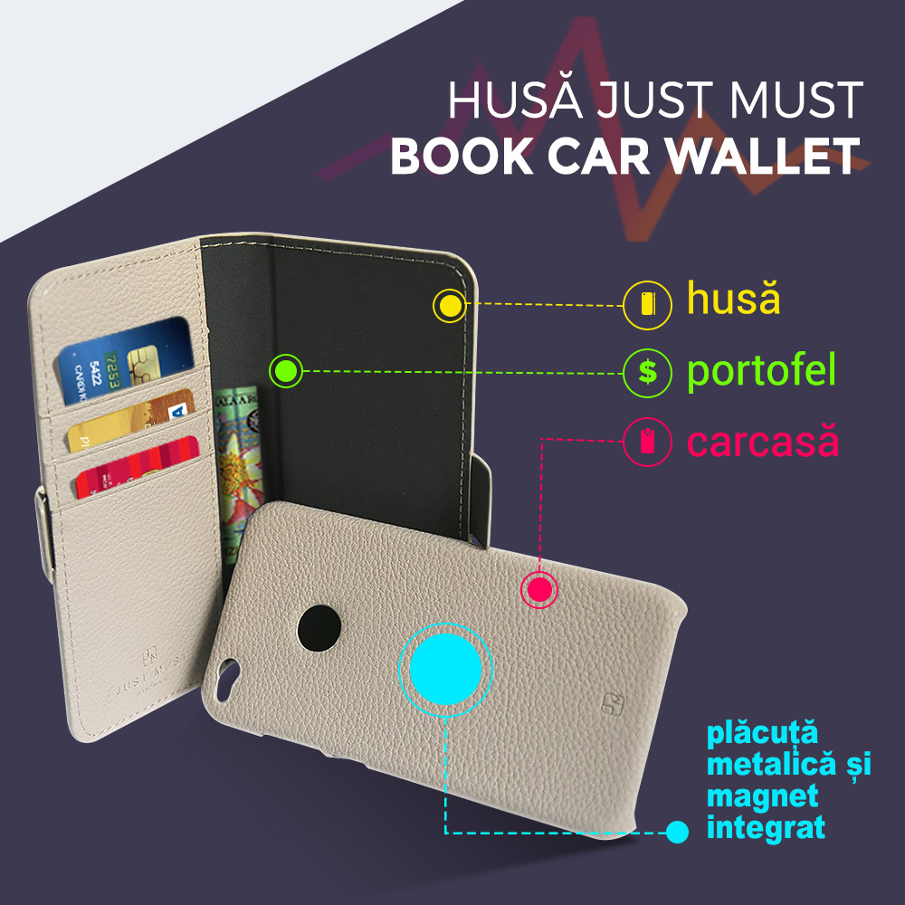 Car Wallet de la Just Must este o gama de huse compuse din doua componente: husa tip carte ce are un magnet integrat si o carcasa detasabila cu placuta metalica integrata. Cele doua se unesc usor magnetic si se poate utiliza simplu fie ca si carcasa fie ca husa tip carte. Datorita placutei metalice incorporate se poate utiliza cu orice suport magnetic. Pe spate nu prezinta decupaj pentru camera fiind necesara detasarea carcasei pentru a utiliza aceasta functie a telefonului