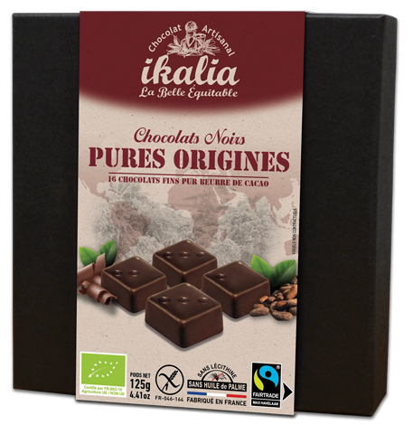Bomboane de ciocolată neagră cu concentrație mare de cacao, de trei origini diferite, fără ulei de palmier sau gluten.