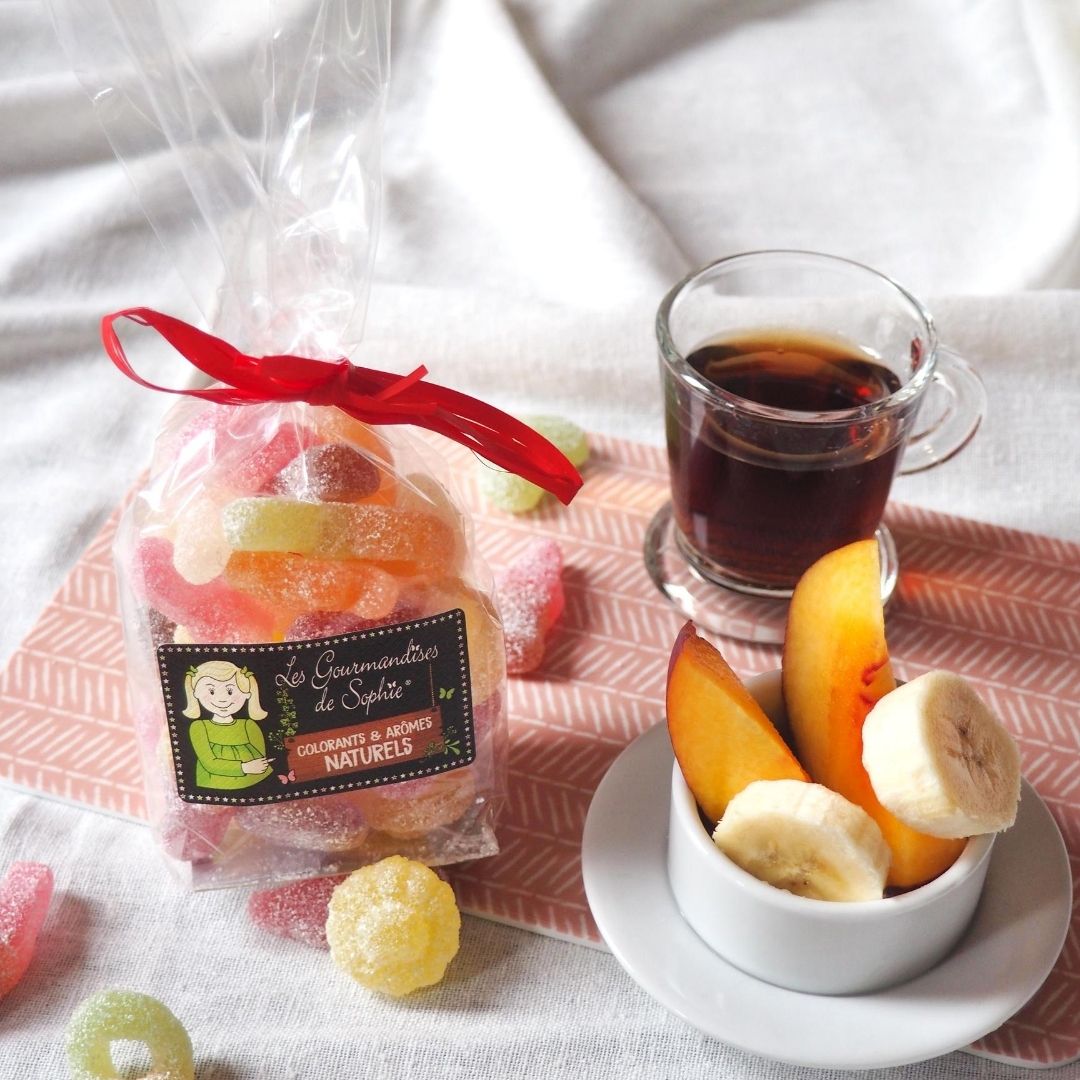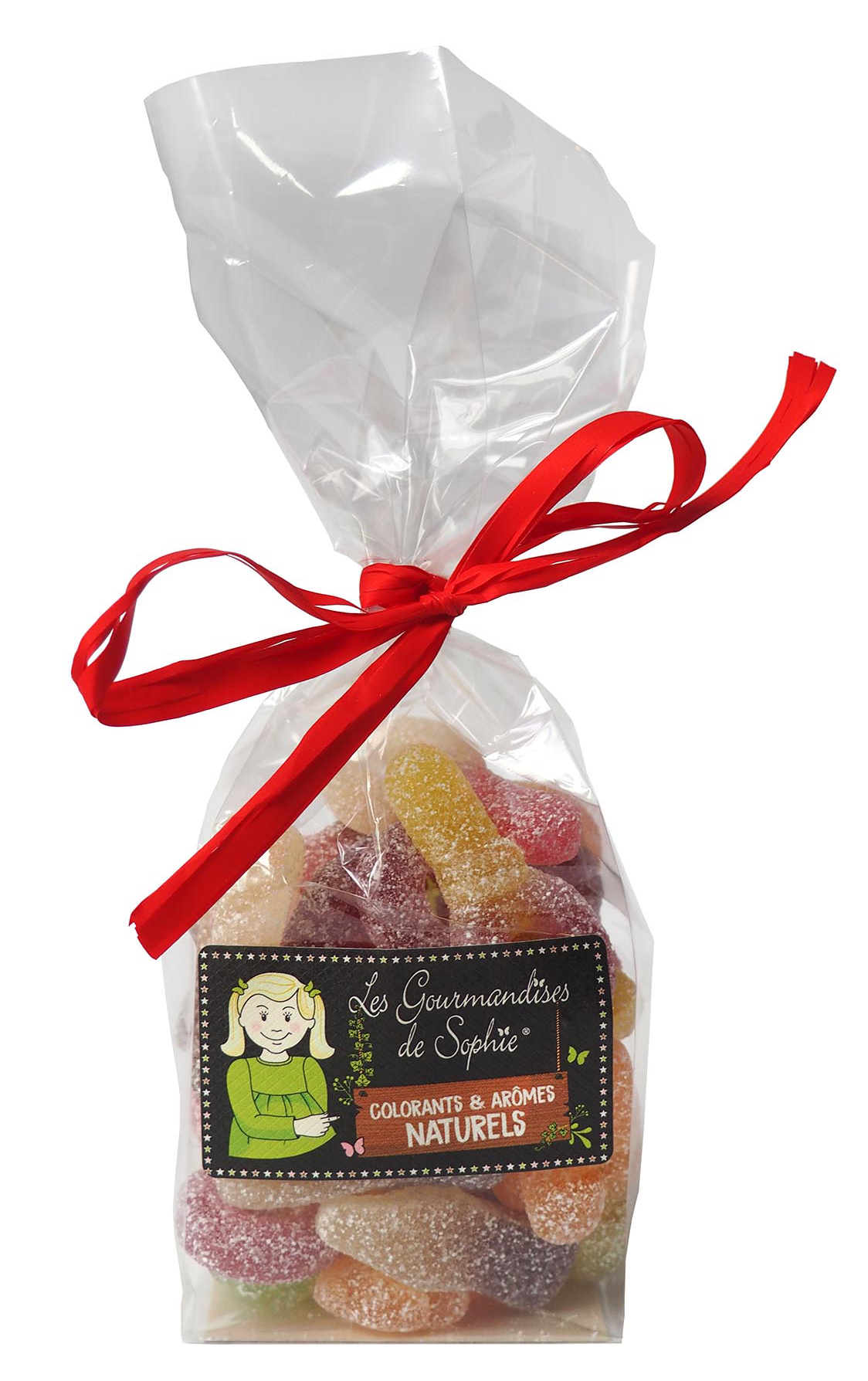 zahar, sirop de glucoza, apa, gelatina, E270, E330, E296, E350, arome, sirop de caramel, concentrat din suc de morcovi negri, colorant alimentar: concentrat de spirulina si sofran, concentrat de struguri, coloranti: E100, E160c