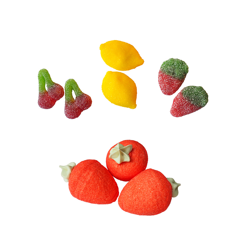 Ingrediente: Capsuni: zhar, sirop de glucoza, amidon, apa, gelatina, acidifianti: E330, E296, E271, corector de aciditate: E325, E350, arome, coloranti:E102*, E129*, E133. Cirese: sirop de glucoza, zahar, apa, gelatina, acidifianti: E330, E296, E270, corector de aciditate: E325, E350, arome, concentrati ( morcov, coacaze negre), coloranti: E100, E133. Lamaie: Sirop de glucoza, zahar, apa, gelatina, umectatnt (E420), acidifianti (E330, E270), gelifiant: pectina, arome, corector de aciditate (E325), coloranti si / sau concentrati: E102*. Capsuni: zahar 48.5%, sirop de glucoza- fructoza 37%, apa 12.1%, gelatina 2.4%, arome 0.05% , ingrediente cu putere de colorare : concentrat de sofranel, extract de sofranel, concentrat de spirulina, colorant: E120, acidifiant: acid citric, amidon de porumb. *Poate avea efecte adverse asupra activitatii si atentiei la copii.