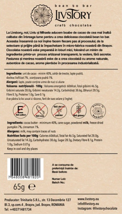 Ciocolată albă cu dovleac și scorțișoară - Livstory, 65g