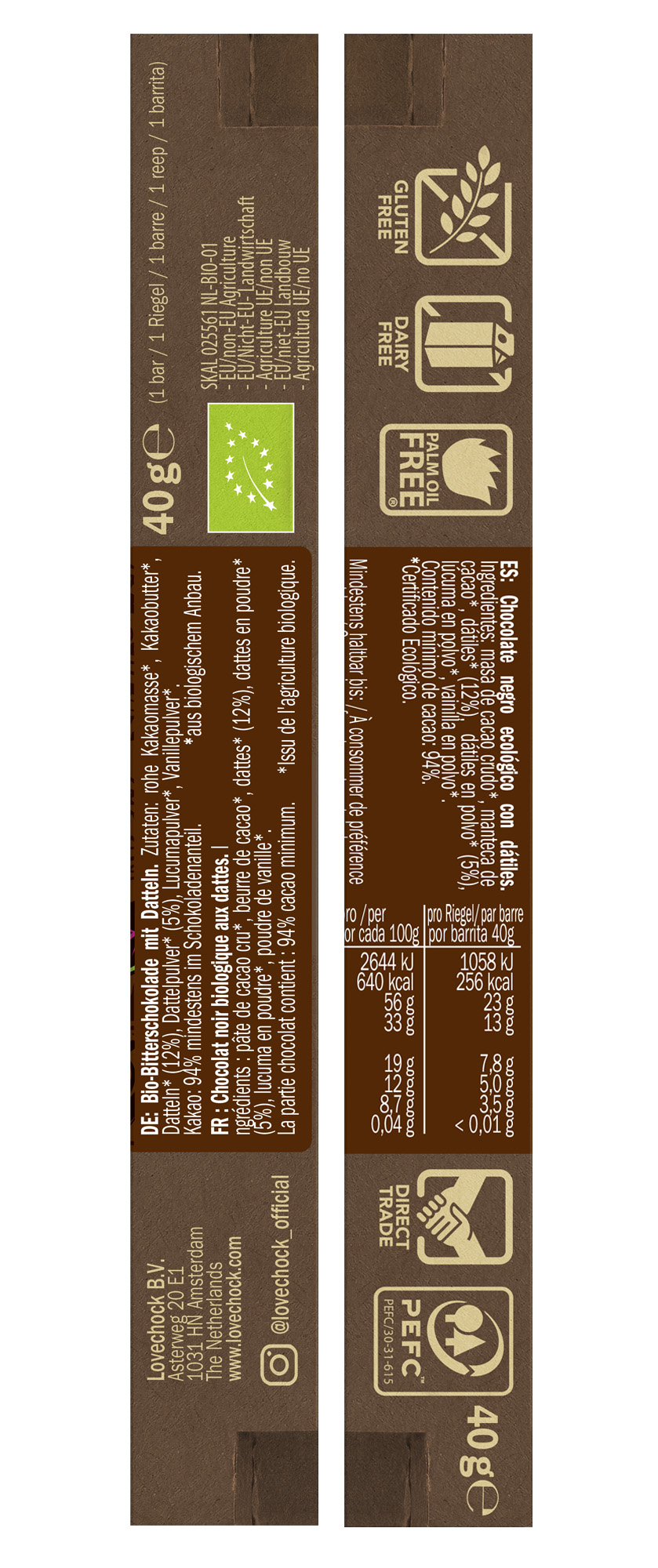 Ciocolată Extra Pure, minim 94% cacao, 100% organică, produs vegan. Ciocolata Lovechock este îndulcită cu nectar de cocos. Ambalajul nu conține plastic, este 100% biodegradabil.