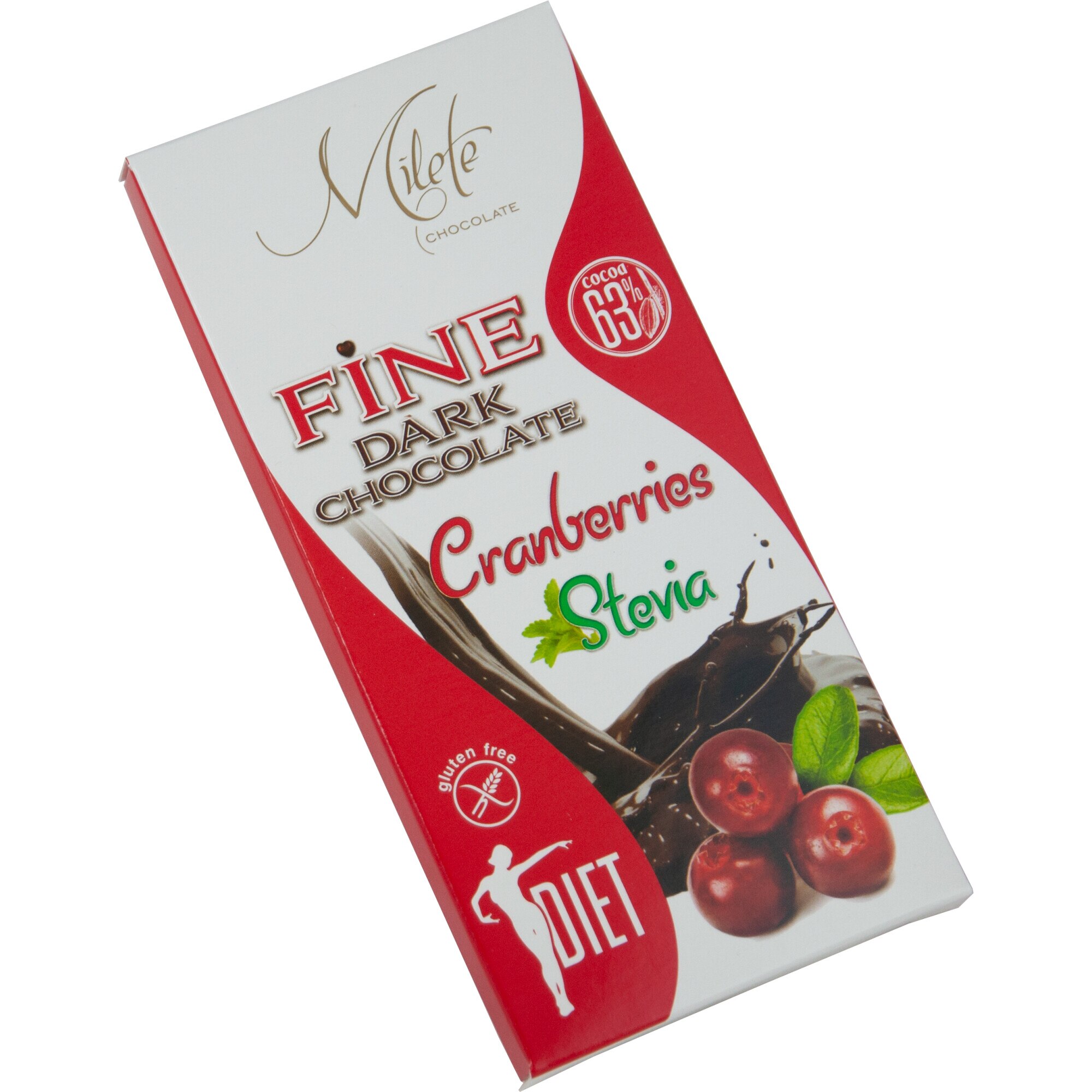 Ciocolată neagră dietetică, cu doar 311 calorii, cu 63% cacao, cu merișoare și îndulcitori (eritritol, stevia).