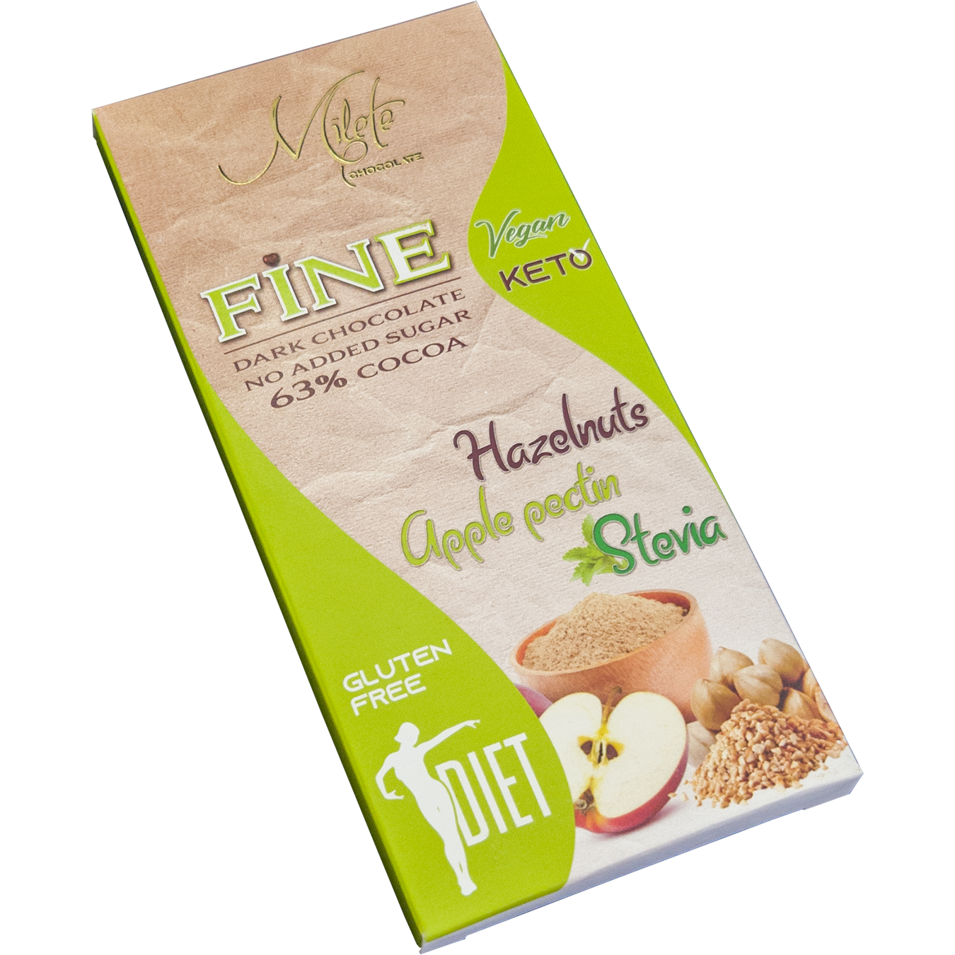 Ciocolată neagră dietetică cu alune de pădure și măr, cu doar 335 de calorii la 80 de grame.