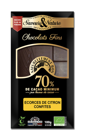 Tableta de ciocolata organica neagra 70% cu aroma de lamaie.