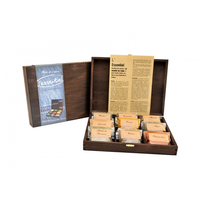 Cutie de lemn cu 9 compartimente și 9 tipuri de condimente: busuioc, coriandru, nucșoară, scorțișoară, curry, cimbru, ierburi de Provence, chimion, boia dulce.
