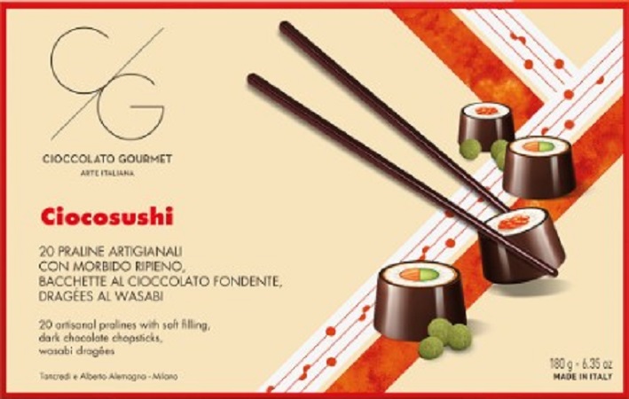 Cutie cu delicatese Ciocosushi: 10 praline din ciocolata neagra, cu umplutura de ghimbir si cafea, 10 praline din ciocolata cu lapte, cu umplutura de mango si alune, betisoare (chopsticks) din ciocolata neagra si drajeuri cu wasabi.