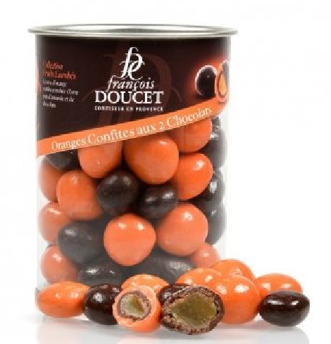 Coaja de portocale confiata si taiata cubulete, macerata in ulei esential de portocale, invelita in pasta de migdale si trasa in 2 tipuri de ciocolata: neagra si alba.
