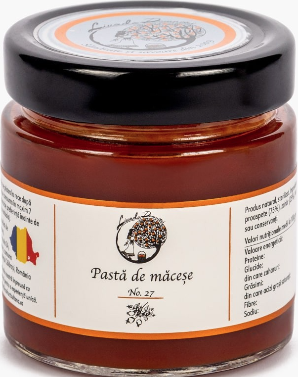 Pasta de Macese, produsul no. 27 din gama Livada Domnitei a firmei Eco Fruct Sultana, realizat fara coloranti si conservanti. Este un produs artizanal obtinut din fructe proaspete romanesti.