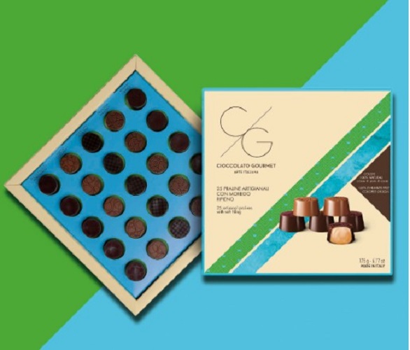 Cutie cu 25 de praline artizanale de inalta calitate, produse in Italia. Cutia contine praline din ciocolata neagra umpluta cu fistic, fructe de padure si portocale, precum si praline din ciocolata cu lapte umplute cu nuca de cocos si alune de padure. Ingrediente naturale, fara coloranti.