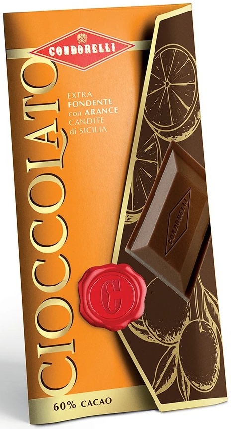Cacao min. 60, zahar, portocale confiate 10%, emulsificatori, acid citric.