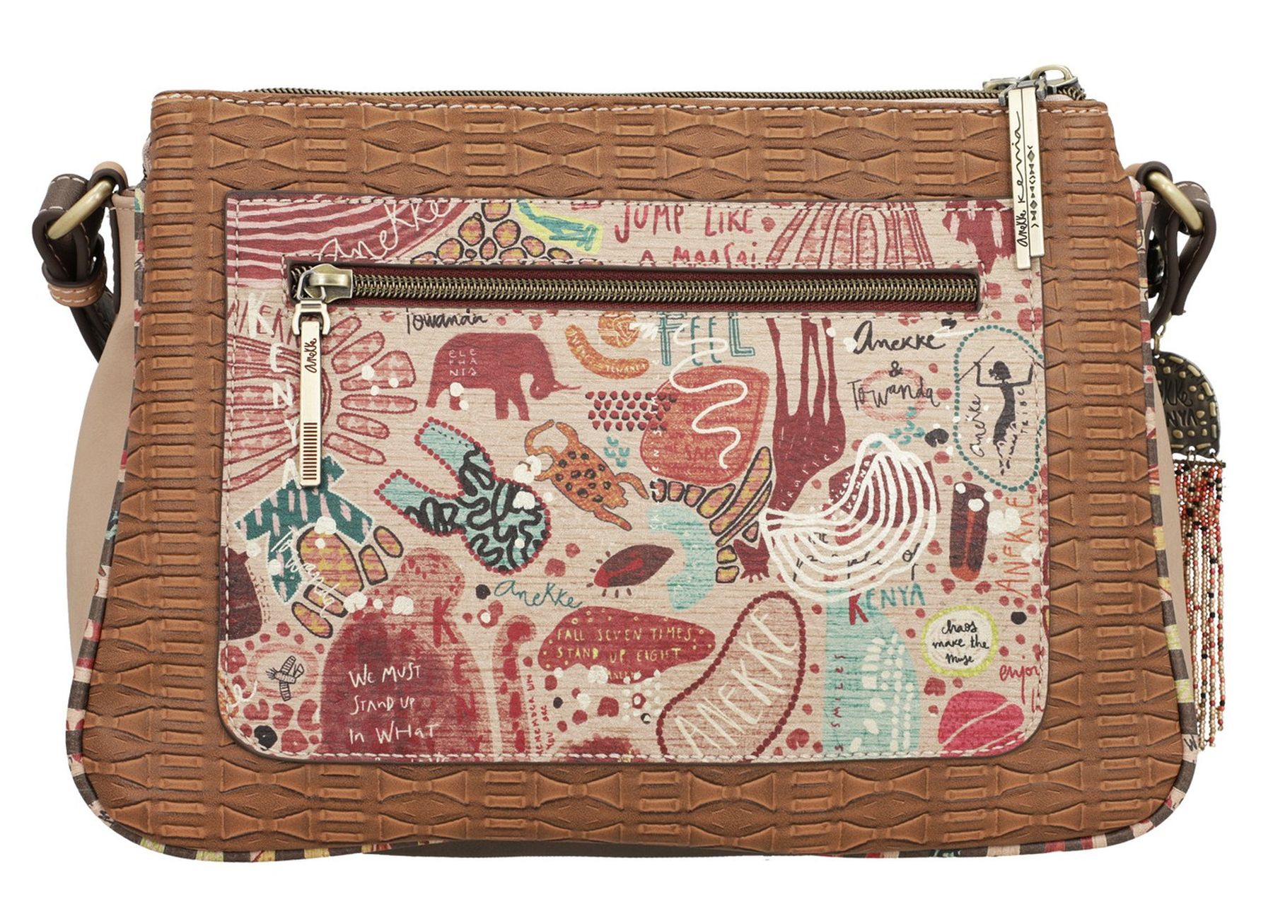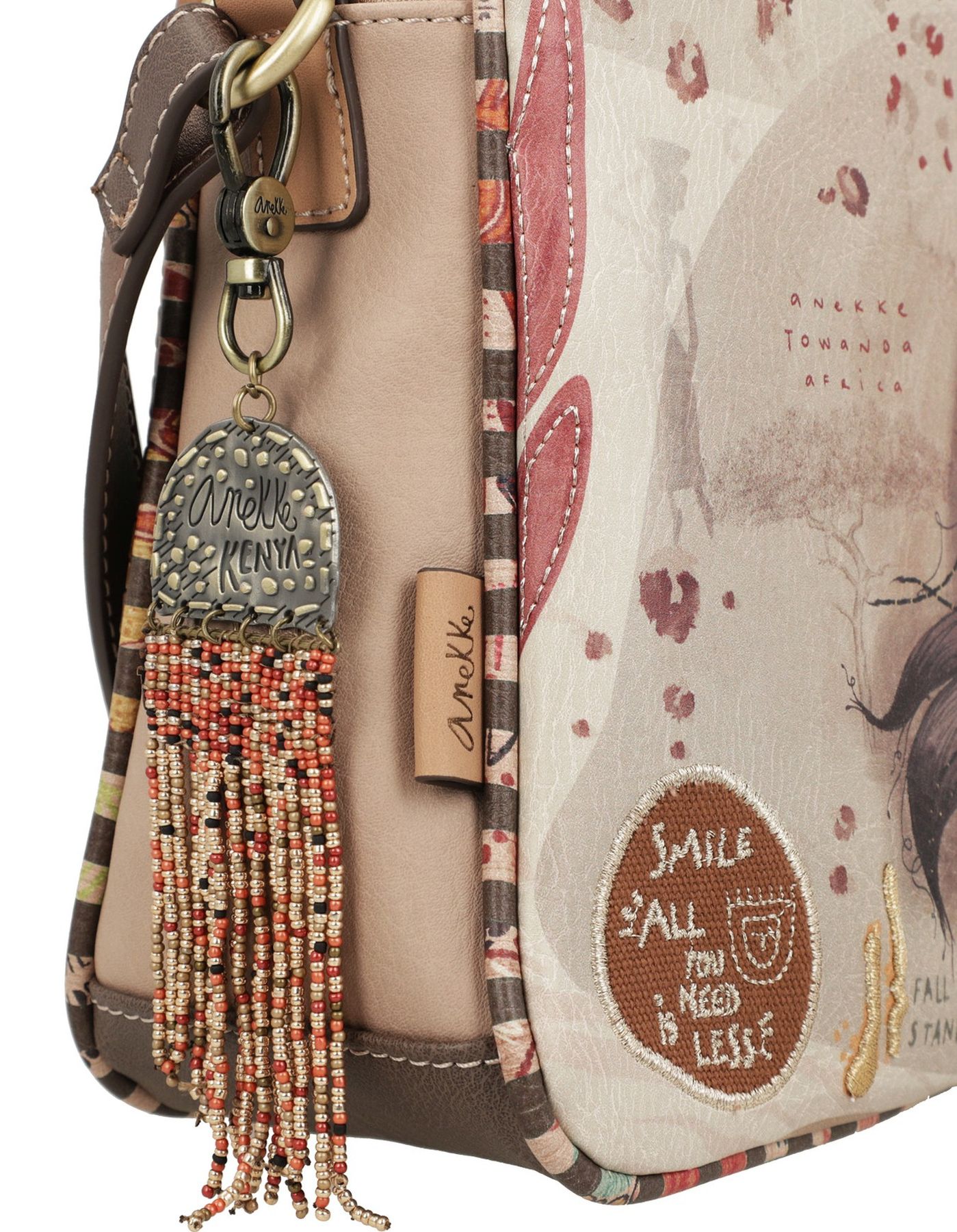 Cu această geantă, veți simți că purtați întotdeauna o parte din Kenya cu voi. Fiecare parte a genții are un model diferit, cu nenumărate detalii care o fac unică, cum ar fi broderii, aplicații decorative sau un breloc original.