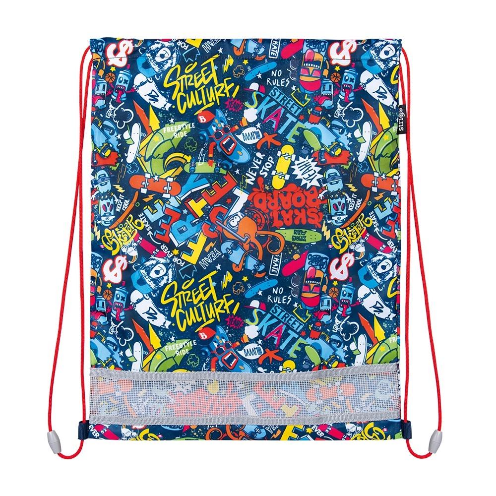 Colecție unică de genți Strigo! Le puteți completa cu o cutie pentru creioane, o sticlă de apă și o cutie de prânz! Geanta este fabricată din poliester, reglabilă cu șiruri, cu o plasă de ventilație în partea inferioară.