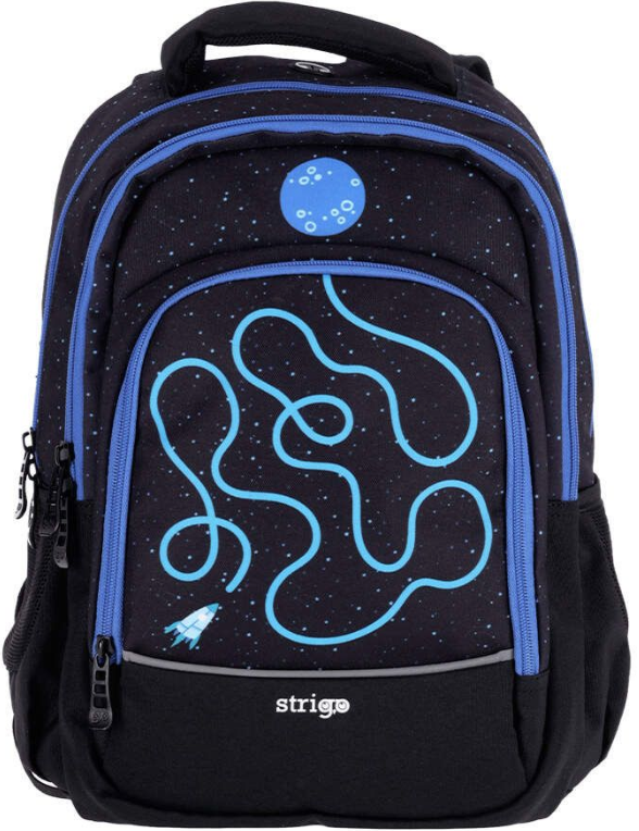 Ghiozdanul școlar Kosmos, spațios și ușor , de culoare neagră, cu model, cântărește doar 650 de grame!
