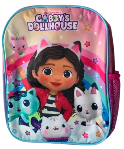Ghiozdan mic Gabby's Dollhouse cu 1 compartiment ce are deschidere cu fermoar, 1 buzunar lateral, bretele buretate si reglabile. Fermoarul este accesorizat cu personajele in miniatura.