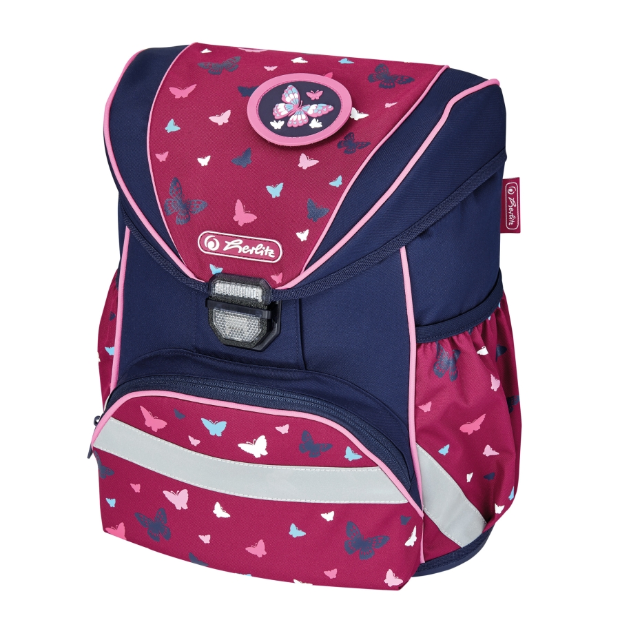 Ghiozdan model Ultralight, cu spate buretat, ergonomic și aerisit, bretele pentru umeri reglabile, mâner practic, greutate scăzută (750g), compartiment interior principal cu un spațiu separat pentru cărți, închidere cu mecanism Click ușor de utilizat și prevăzut cu material reflectorizant, închidere suplimentară a compartimentului interior cu șnur, buzunar frontal cu fermoar, două buzunare laterale cu elastic, material reflectorizant Orafol (fărp PVC) aplicat pe ghiozdan pentru vizibilitate optimă, bază din material rigid pentru o stabilitate maximă, include două accesorii interschimbabile din cauciuc, cu scai, motiv Butterfly.