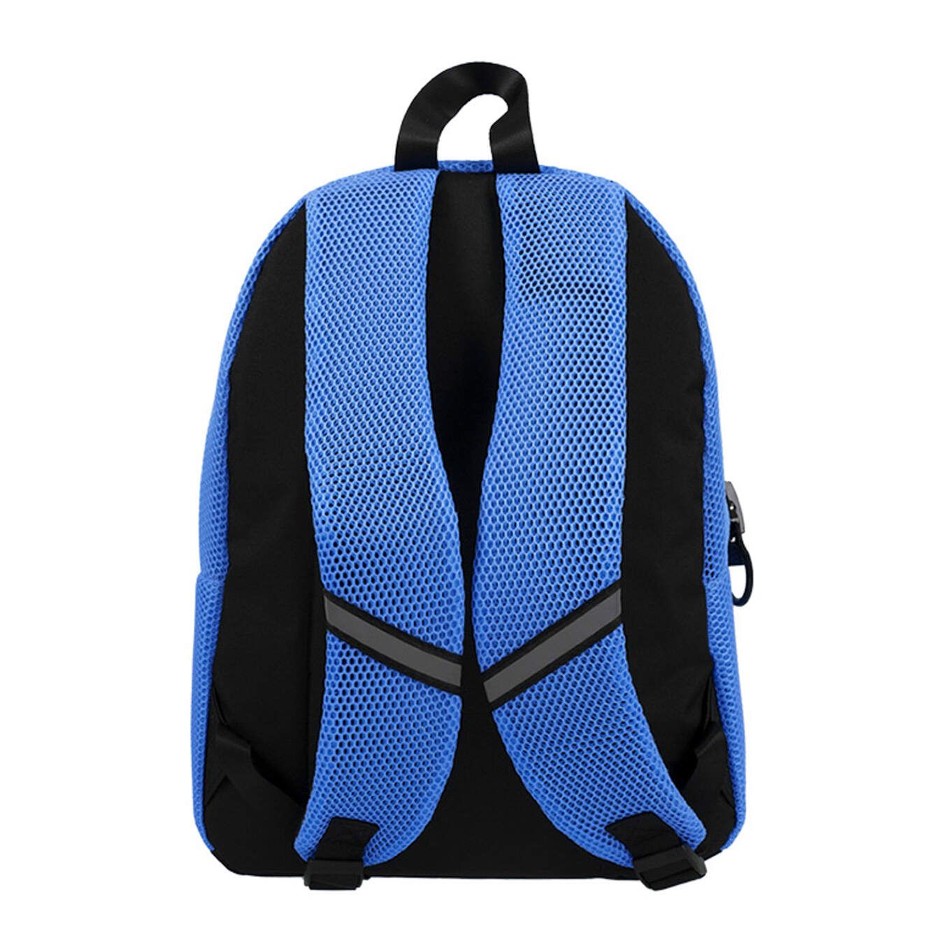 Este un rucsac ușor, de culoare albastră, cu o capacitate de 23 litri, potrivit pentru documente și caiete în format A4. Se remarcă printr-un fermoar lat, care oferă întregului rucsac un aspect unic și modern. În plus, imprimeul de pe față este acoperit cu o plasă colorată, completând astfel designul său original.