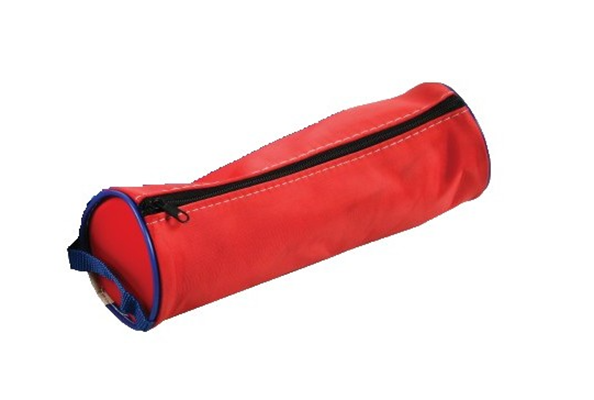 Penarul cilindric roșu este produs din vinil și prezintă o închidere cu fermoar.