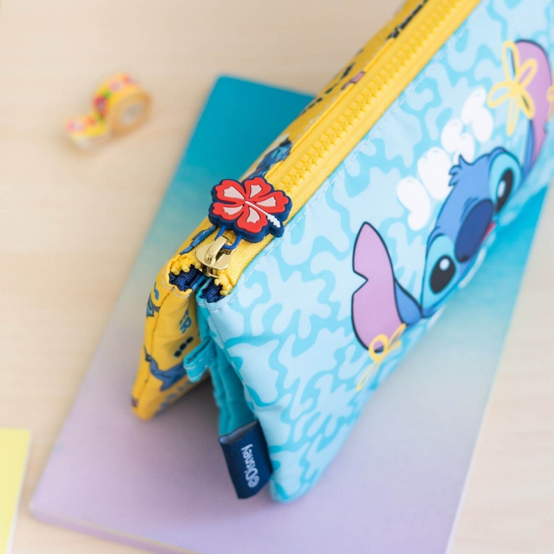 Acest penar din colecția Stitch Tropical de la Disney este ideal pentru a-ți păstra creioanele, pixurile și alte accesorii, bine organizate. Dispune de trei compartimente cu închidere cu fermoar. Compartimentul central are fermoar propriu. Este fabricat din poliester de înaltă calitate.