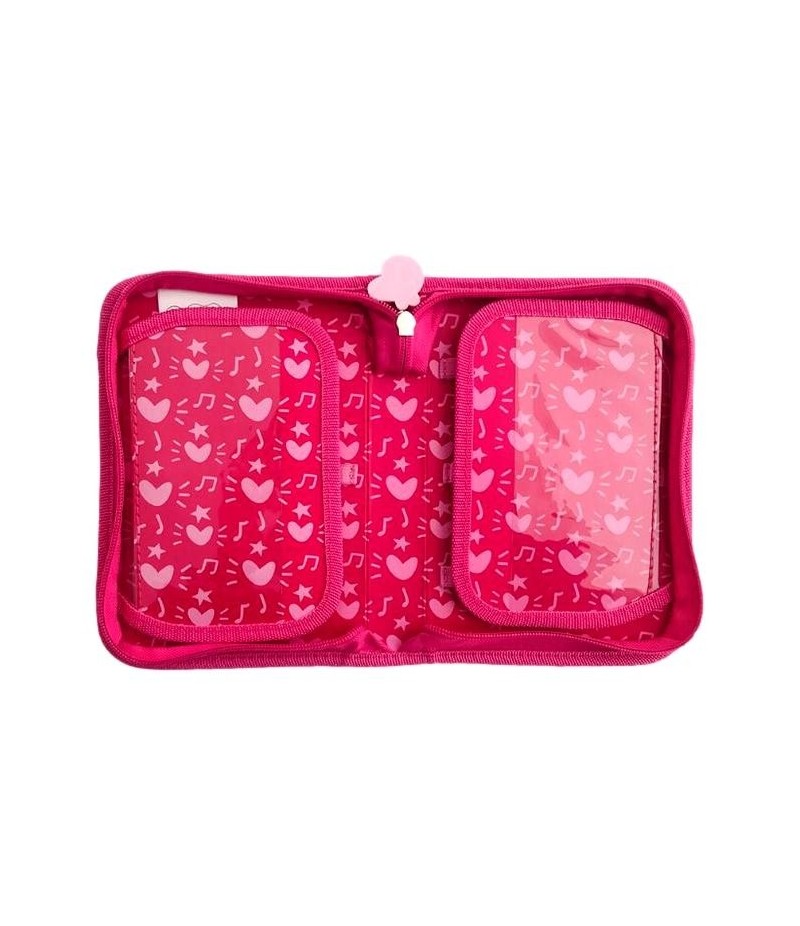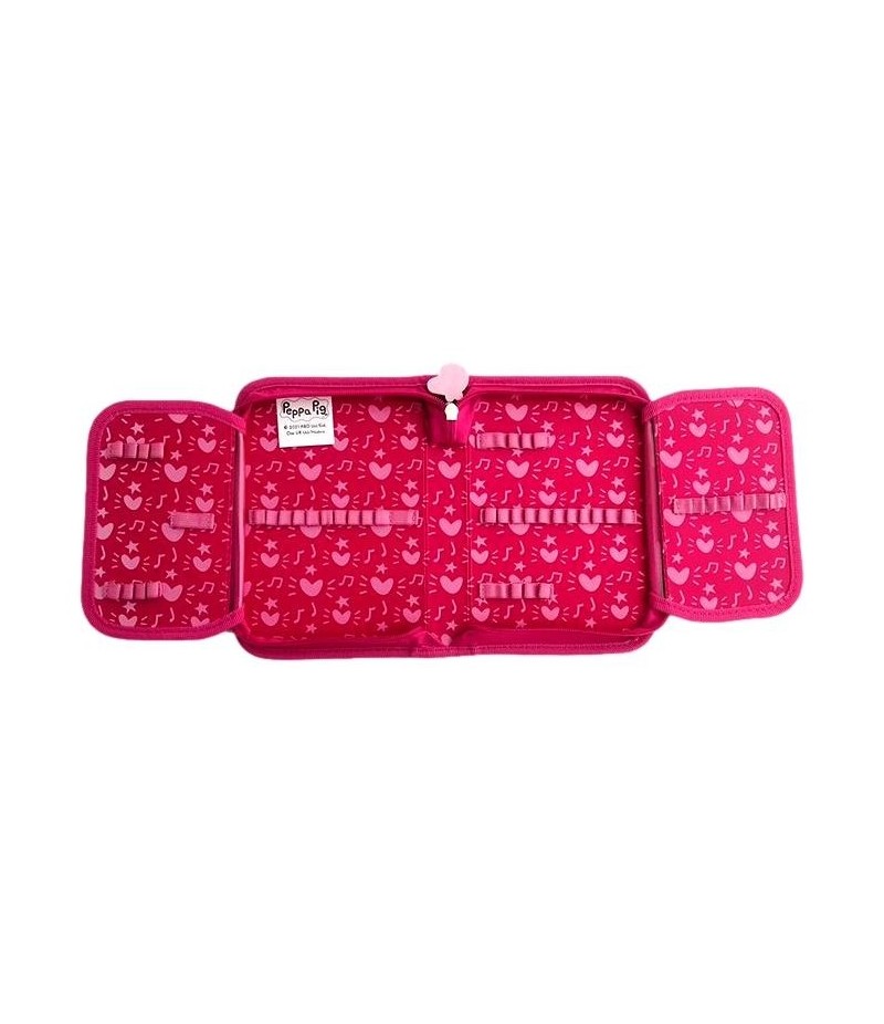3 spatii radiera/ascutitoare si 1 spatiu pentru rigla de 15 cm, fermoarul este accesorizat cu personajele in miniatura.