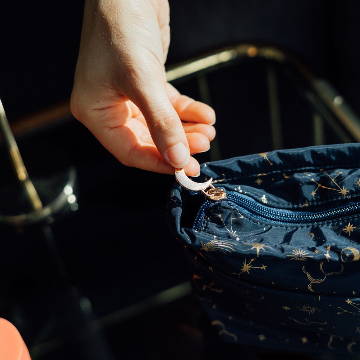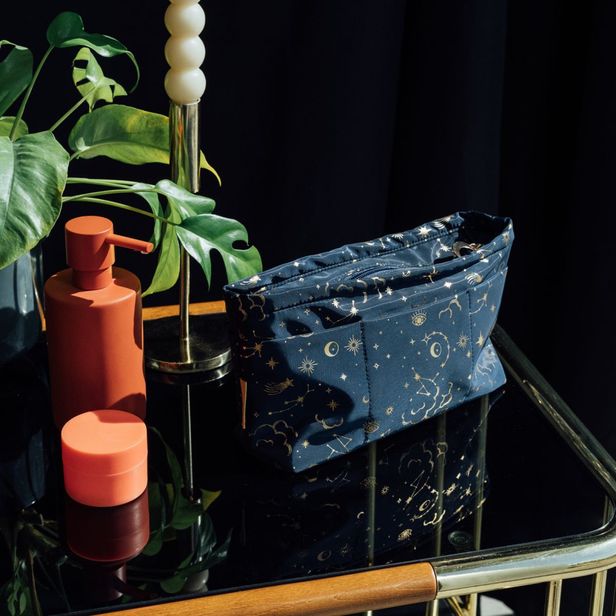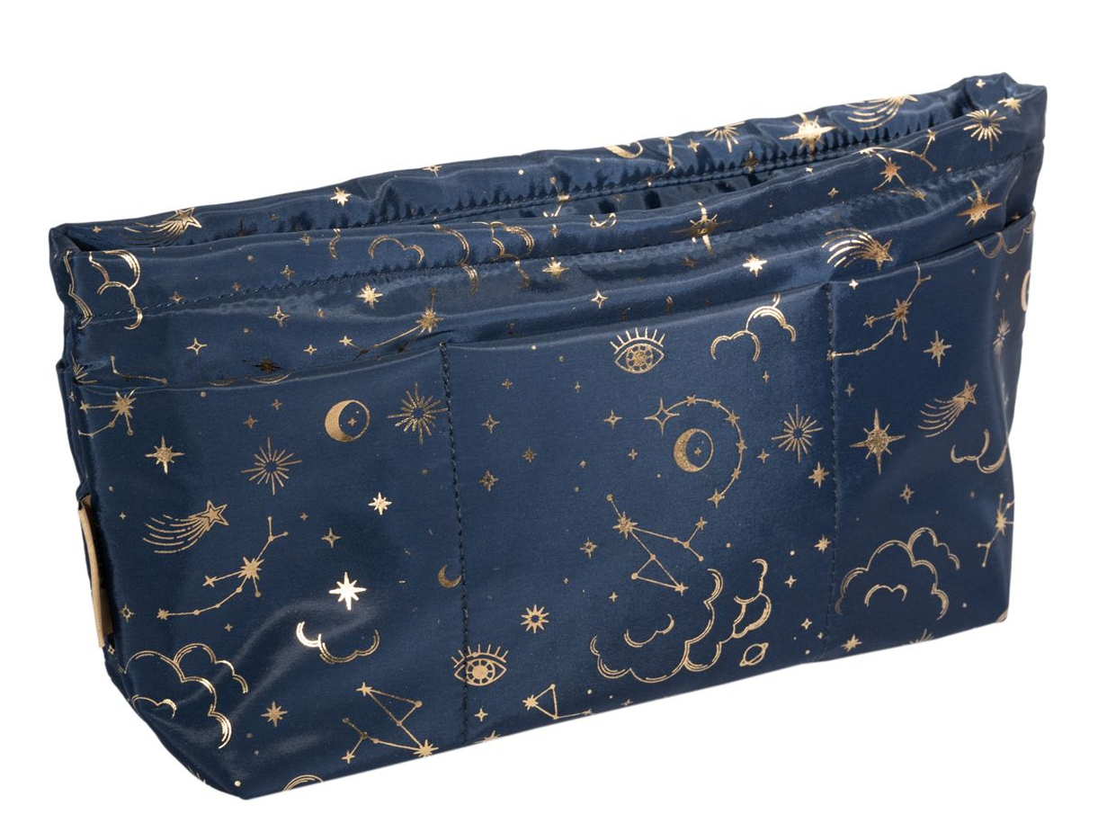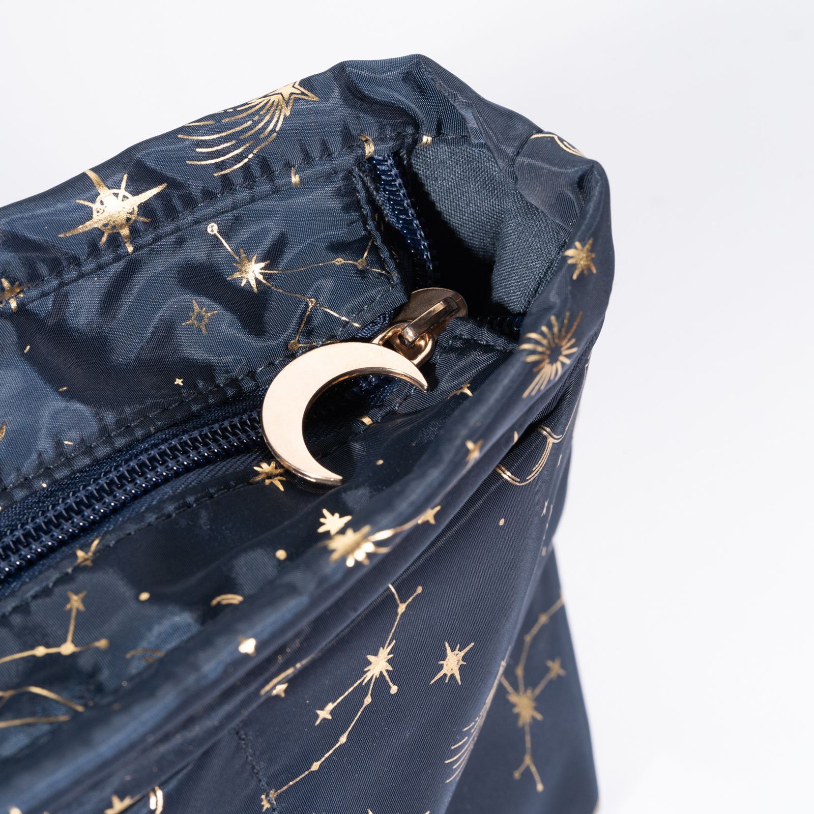 Organizați-vă esențialele cu această geantă elegantă pentru cosmetice din colecția Astral. Materialul bleumarin închis, împodobit cu simboluri astrologice aurii, atrage atenția și adaugă eleganță. Perfectă ca organizator pentru poșetă, geantă de machiaj practică sau penar.