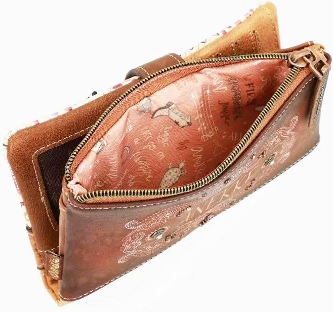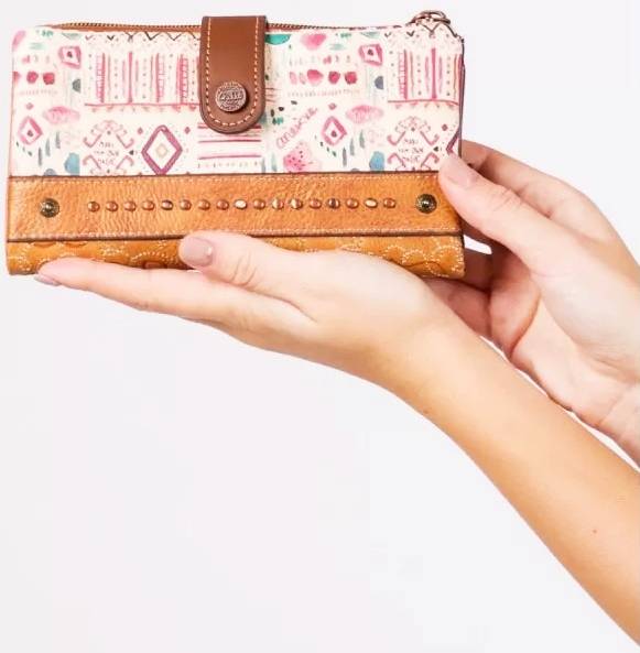Portofel mare cu un design care combină fața maro cu spatele imprimat.