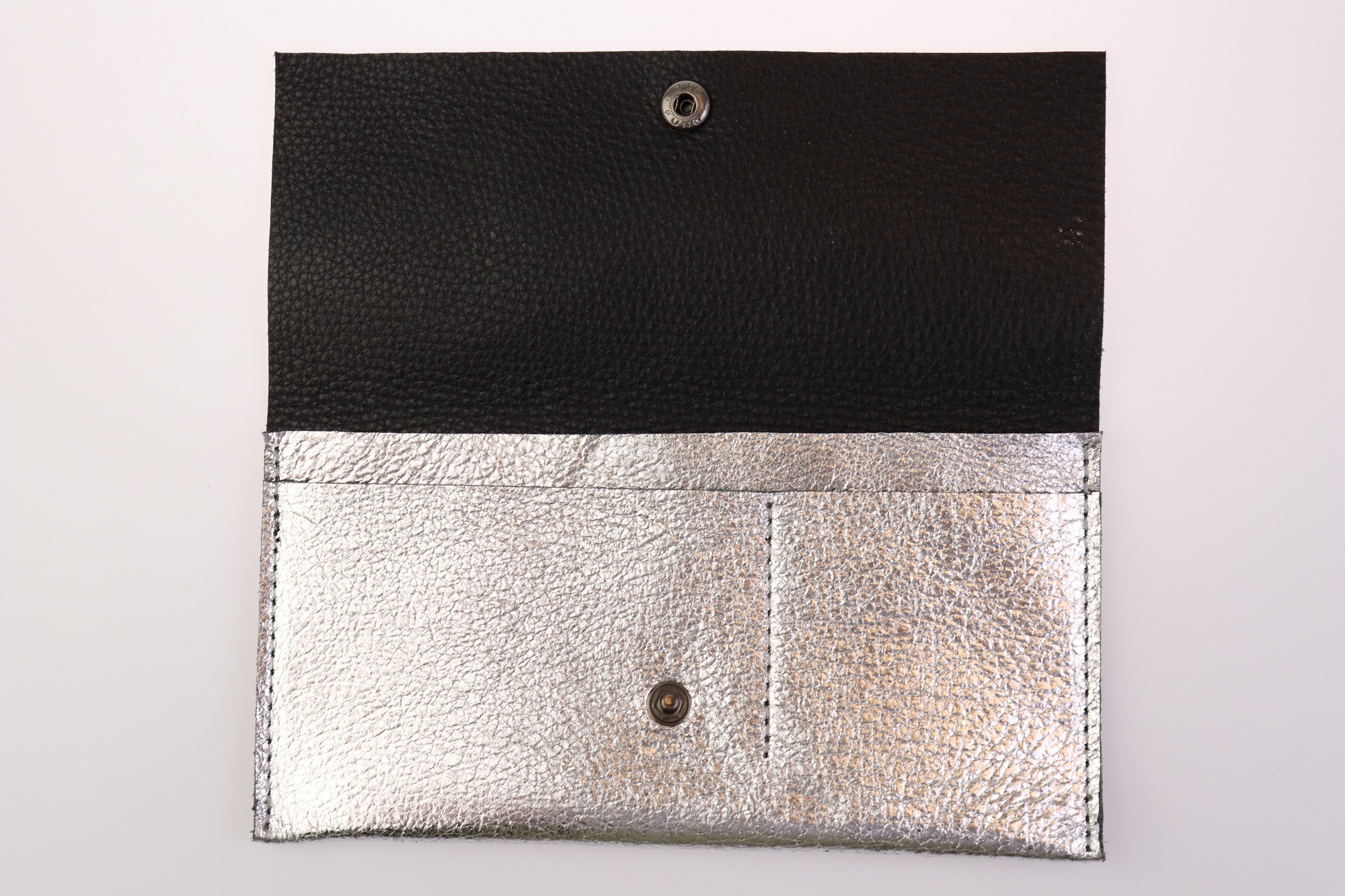 Portofel din piele, realizat manual, cu compartiment pentru bancnote, carduri si monede.