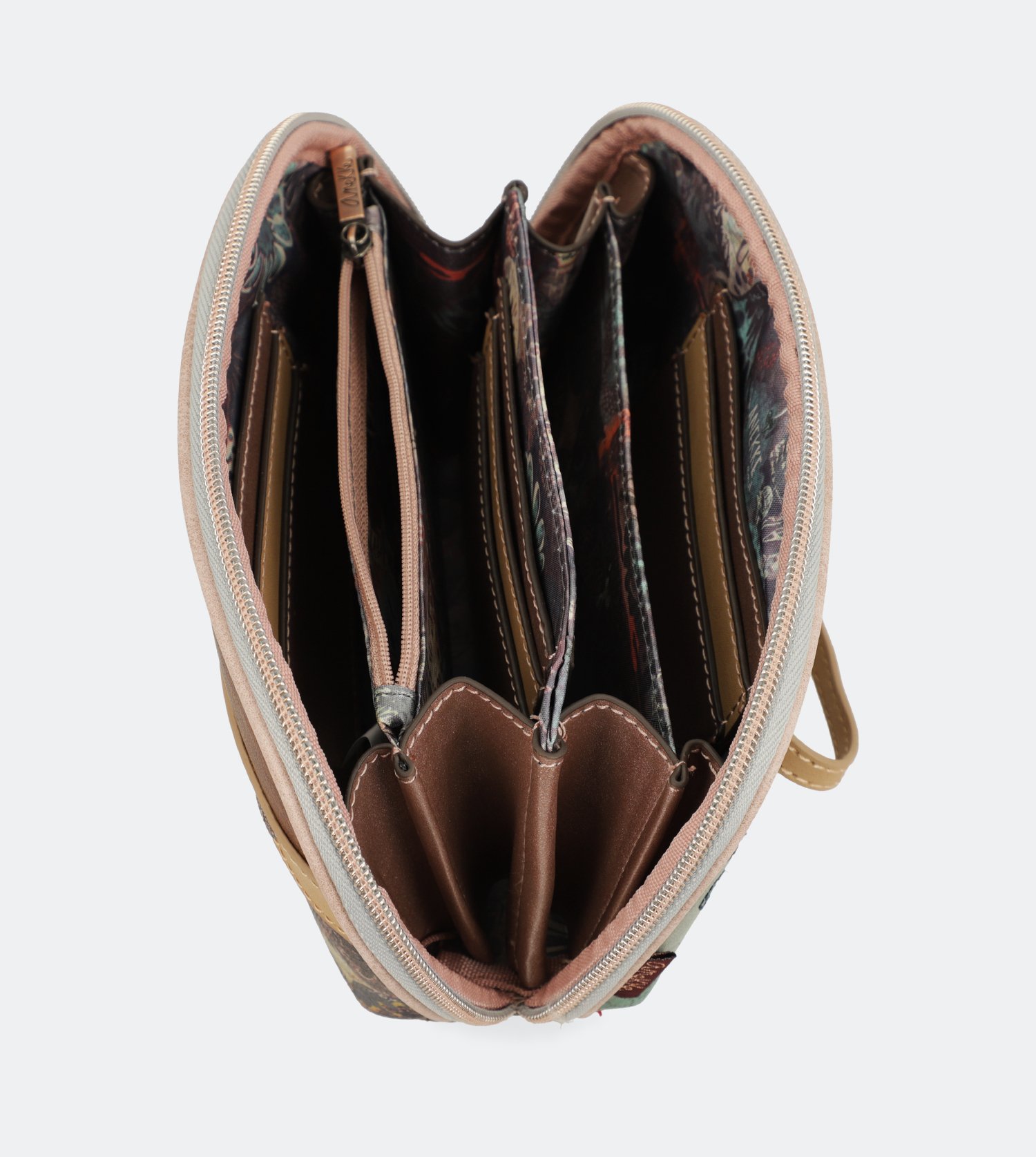 Portofel Ixchel cu diverse compartimente și buzunare la interior și închidere cu fermoar.