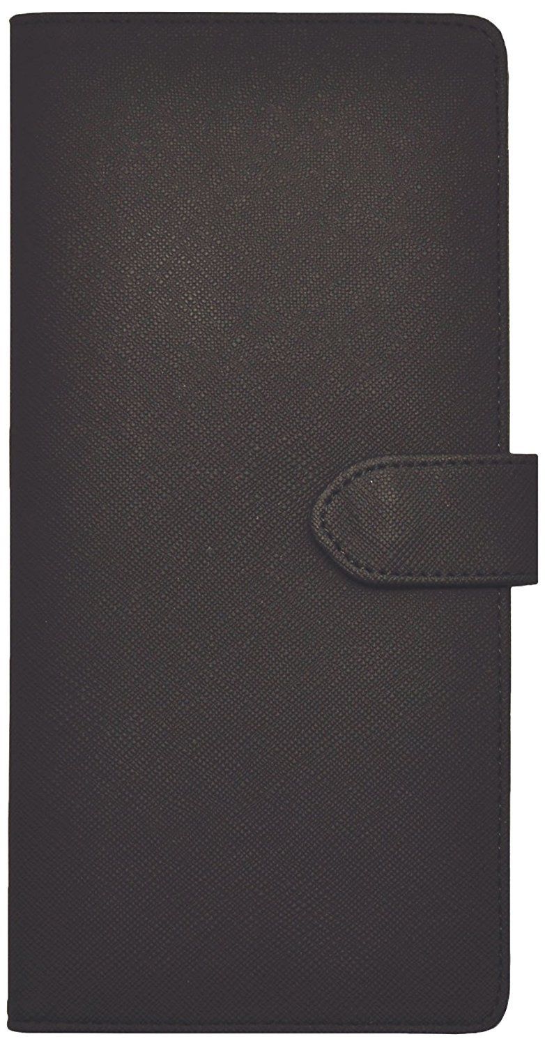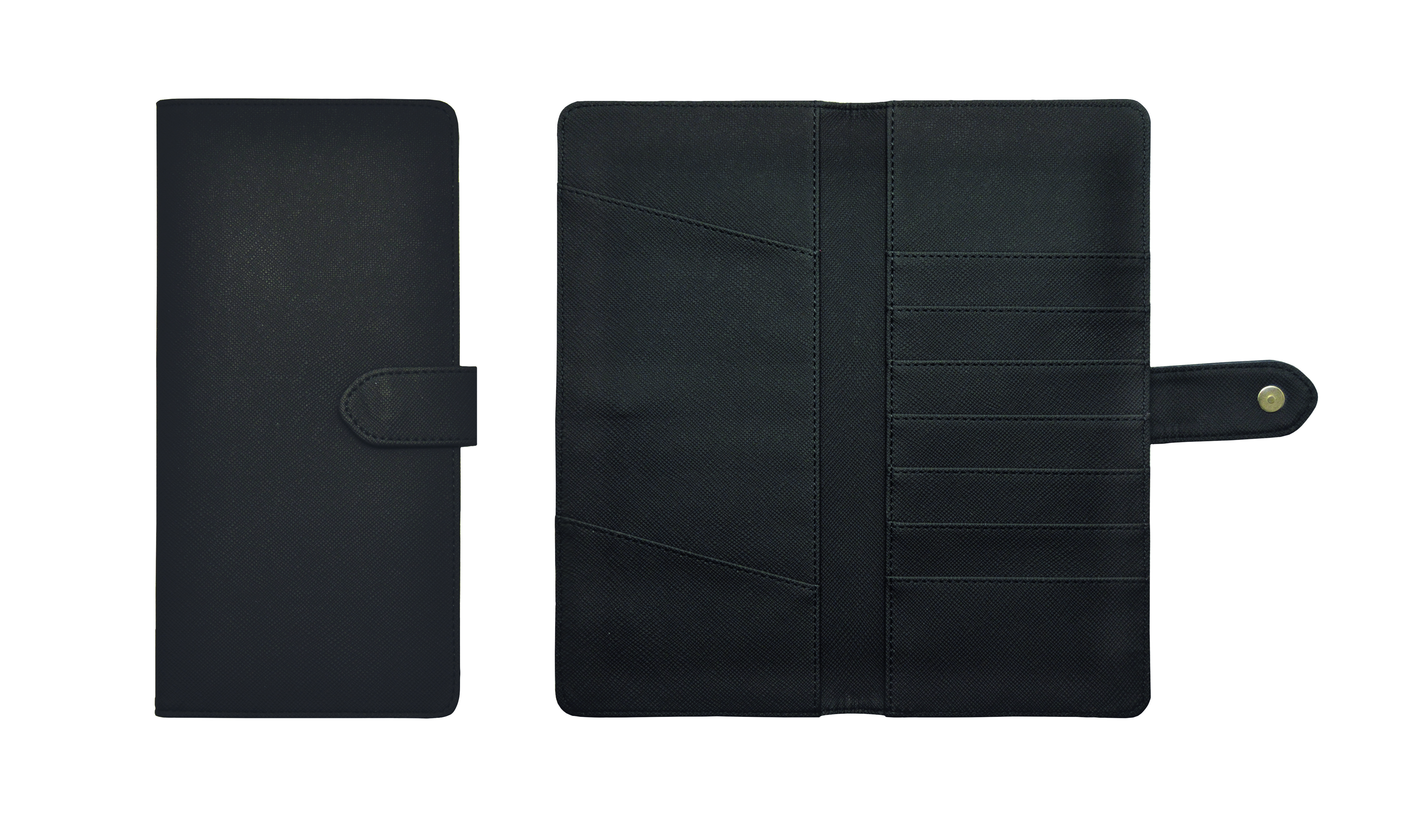Material poliuretan, cu umplutura din poliester, prevazut cu 4 buzunare mari si 7 buzunare mici pentru carduri de credit, cu protectie RFID (protectie impotriva furtului de date - cand portofelul este inchis).
