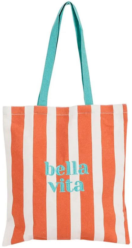 Acest tote bag cu dungi coral este alegerea perfectă pentru zile însorite și stări de bine. Designul său fresh este completat de mânerul albastru intens și mesajul brodat „bella vita”, ce evocă pofta de viață, soare și momente savurate pe îndelete.