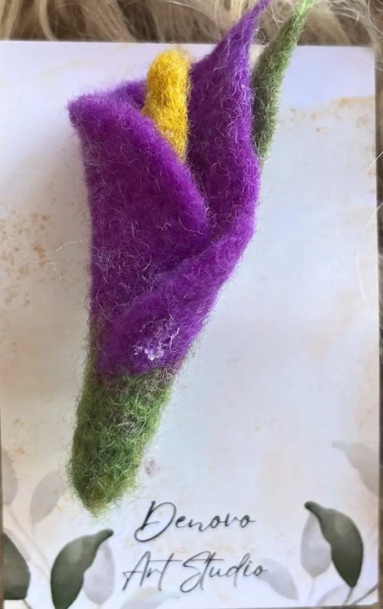 Floare realizata prin impaslirea lanii merinos cu insertii din fibre vascoza. Produs realizat realizat integral manual.