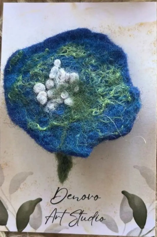 Floare realizata prin impaslirea lanii merinos cu insertii din fibre vascoza. Produs realizat realizat integral manual.