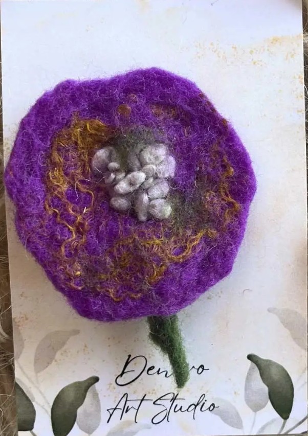 Floare realizata prin impaslirea lanii merinos cu insertii din fibre vascoza. Produs realizat realizat integral manual.